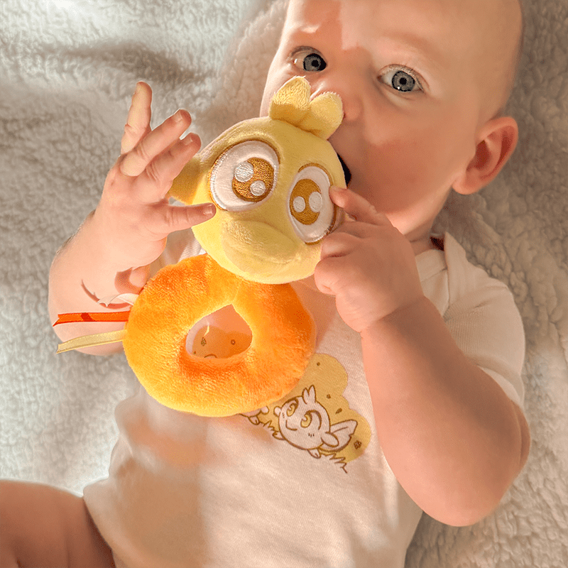 Both soft to the touch and soft on the ears, thanks to its adorable jingling sound, this 6.7-inch (17 cm) rattle inspired by the iconic DOFUS tofu will be a favorite with your little one. And maybe with big kids too!