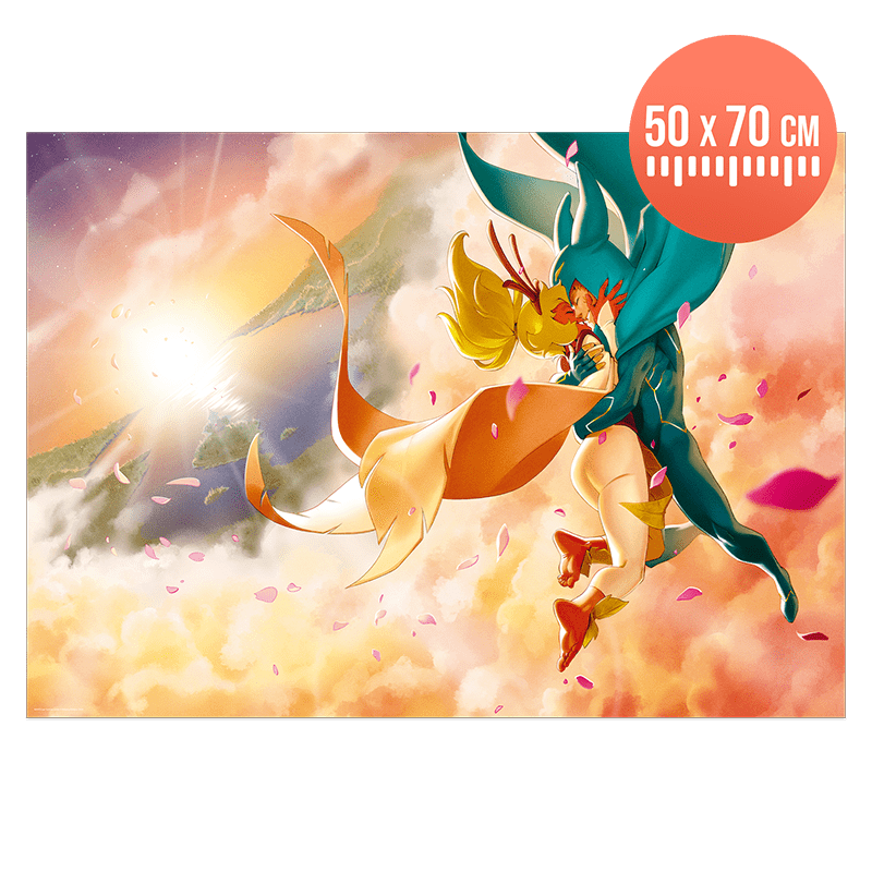 Il aura fallu quatre saisons de la série animée et plusieurs histoires en BD et manga pour que les deux tourtereaux finissent par assumer leurs sentiments. Cette passion dévorante, qui s’exprime à travers les pages du manga WAKFU : La Grande Vague, est capturée dans cette illustration solaire et idyllique.