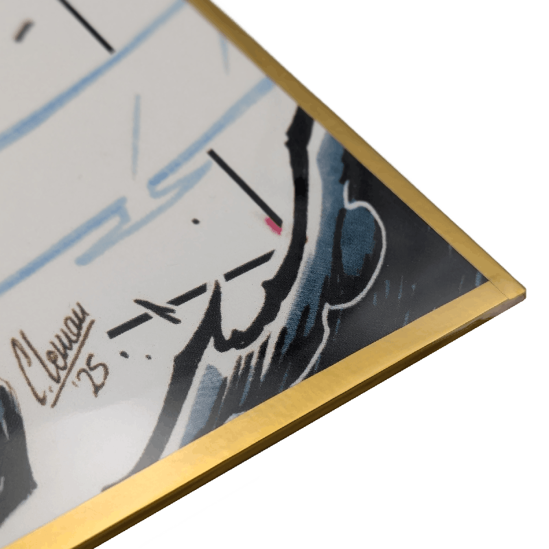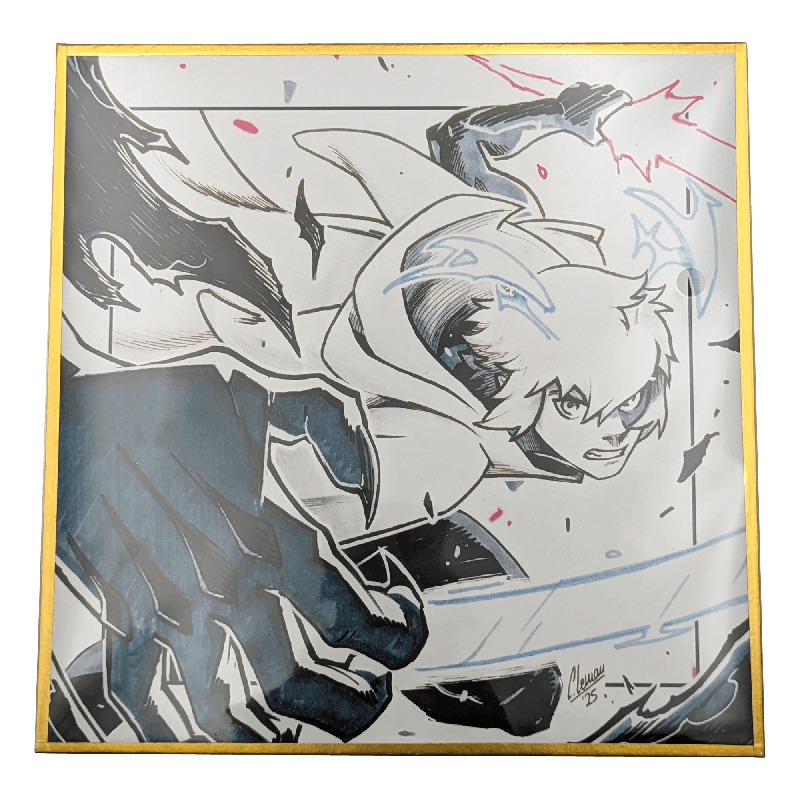 Un shikishi est une planche cartonnée japonaise à bords dorés utilisée pour mettre en valeur une illustration.